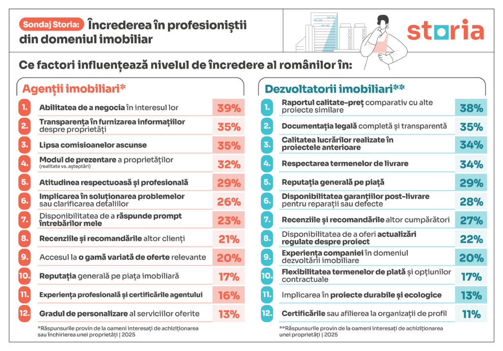 Respondenții interesați de cumpărarea sau închirierea imobilelor declară că nivelul de încredere pe care-l au în agenții imobiliari este influențat în primul rând de abilitatea acestora de a negocia în interesul lor (39%), un procentaj în scădere față de anul trecut (44%). De asemenea, transparența în furnizarea informațiilor despre proprietăți (35%) și lipsa comisioanelor ascunse (35%) sunt criterii care au scăzut în importanță comparativ cu anul trecut, când erau menționate de 41% dintre respondenți.