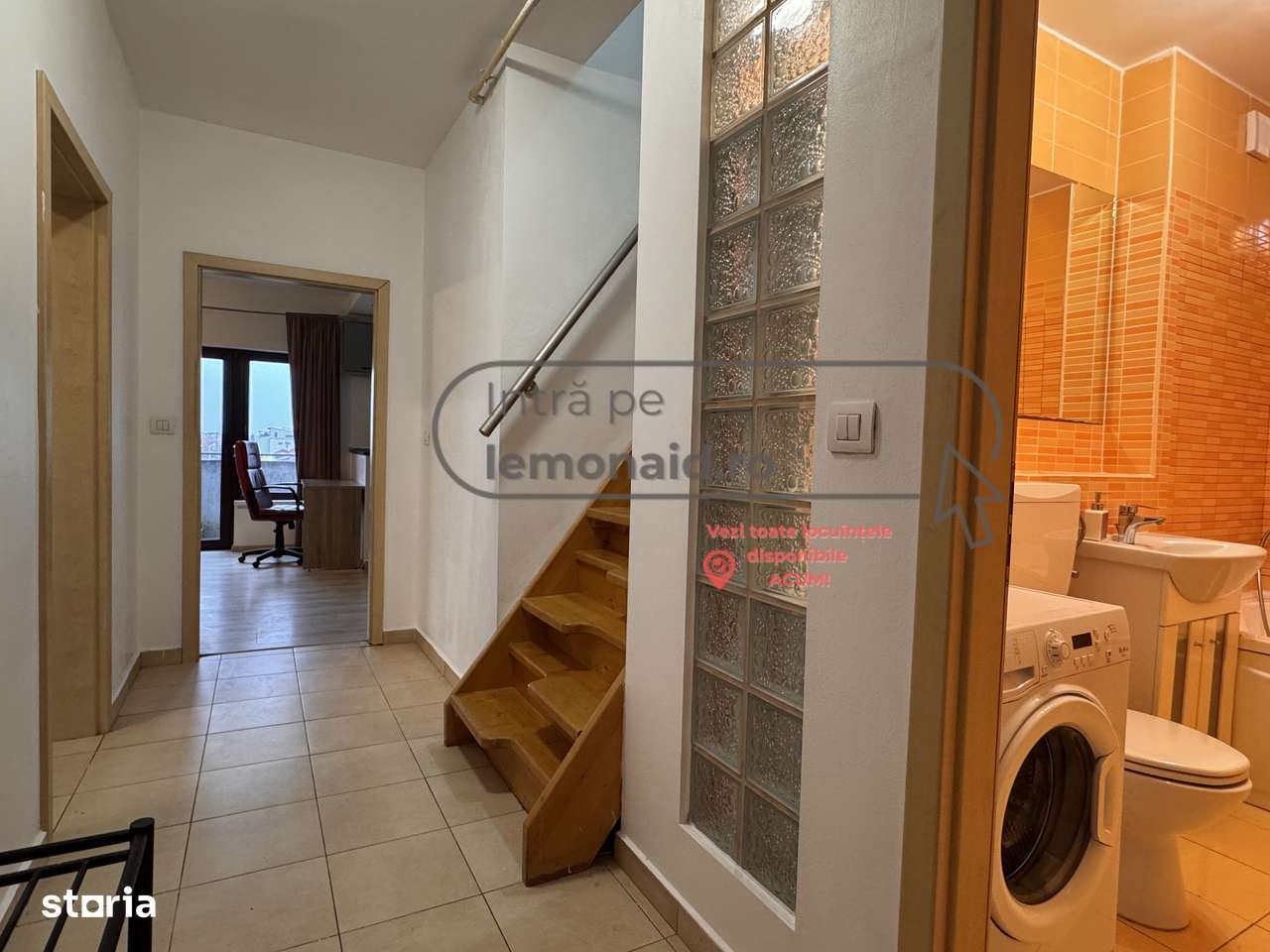 Un apartament pe două niveluri, cu un dormitor și baie la nivelul superior.
