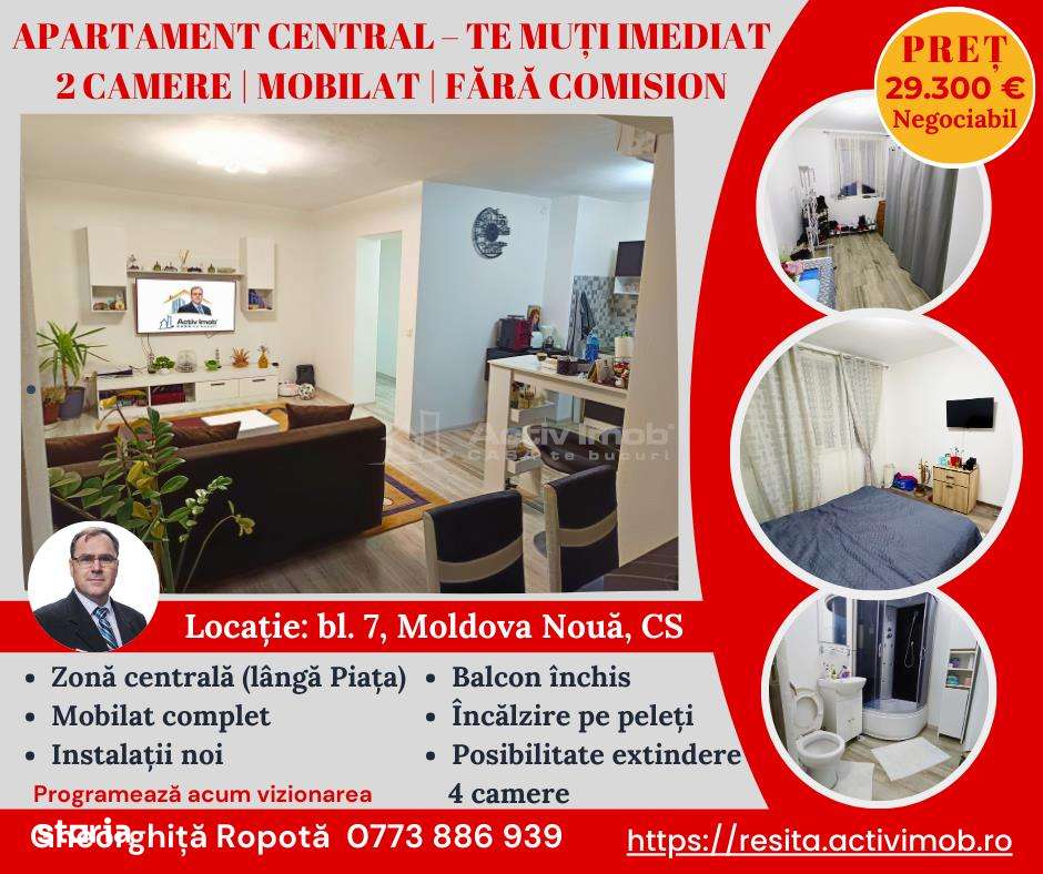 Apartament 2 camere in zona centrala Moldova Noua, langa piata, scoala si parc – Renovare completa, mobilat, fara comisionVa propunem spre vanzare un apartament cu 2 camere, situat in zona centr...