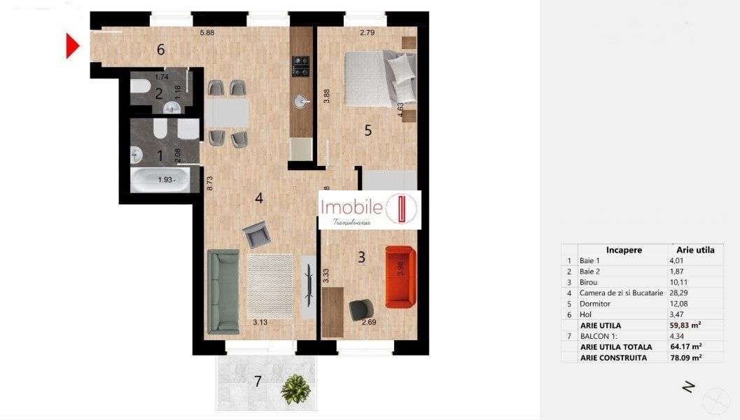 Apartament 3 camere , 2 bai, 65 mp utili + Terase 22mp, Wings Frunzisu