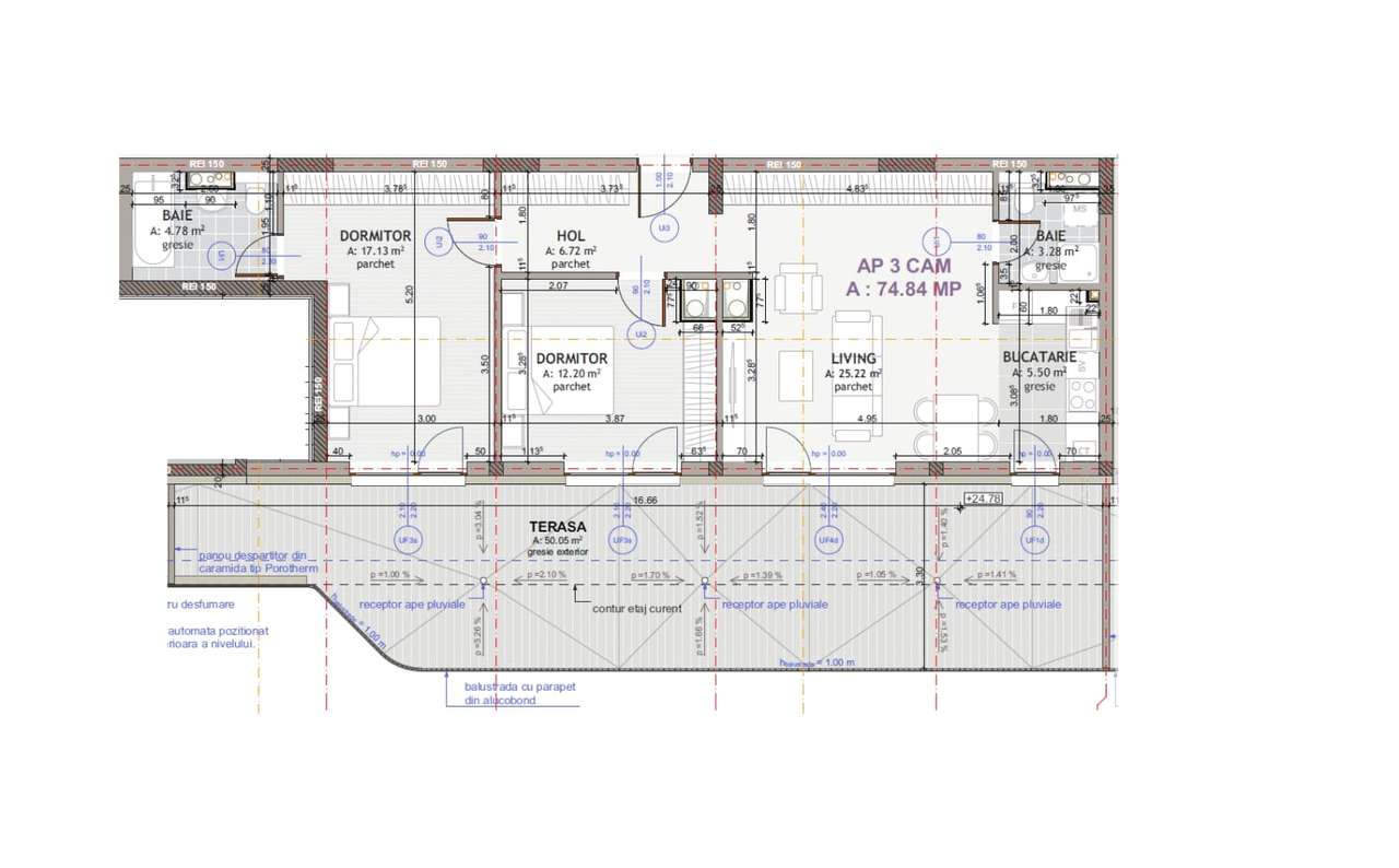 Comision 0%, Apartament 3 cam, 74.84 mp + terasa 50.05 mp, Floresti