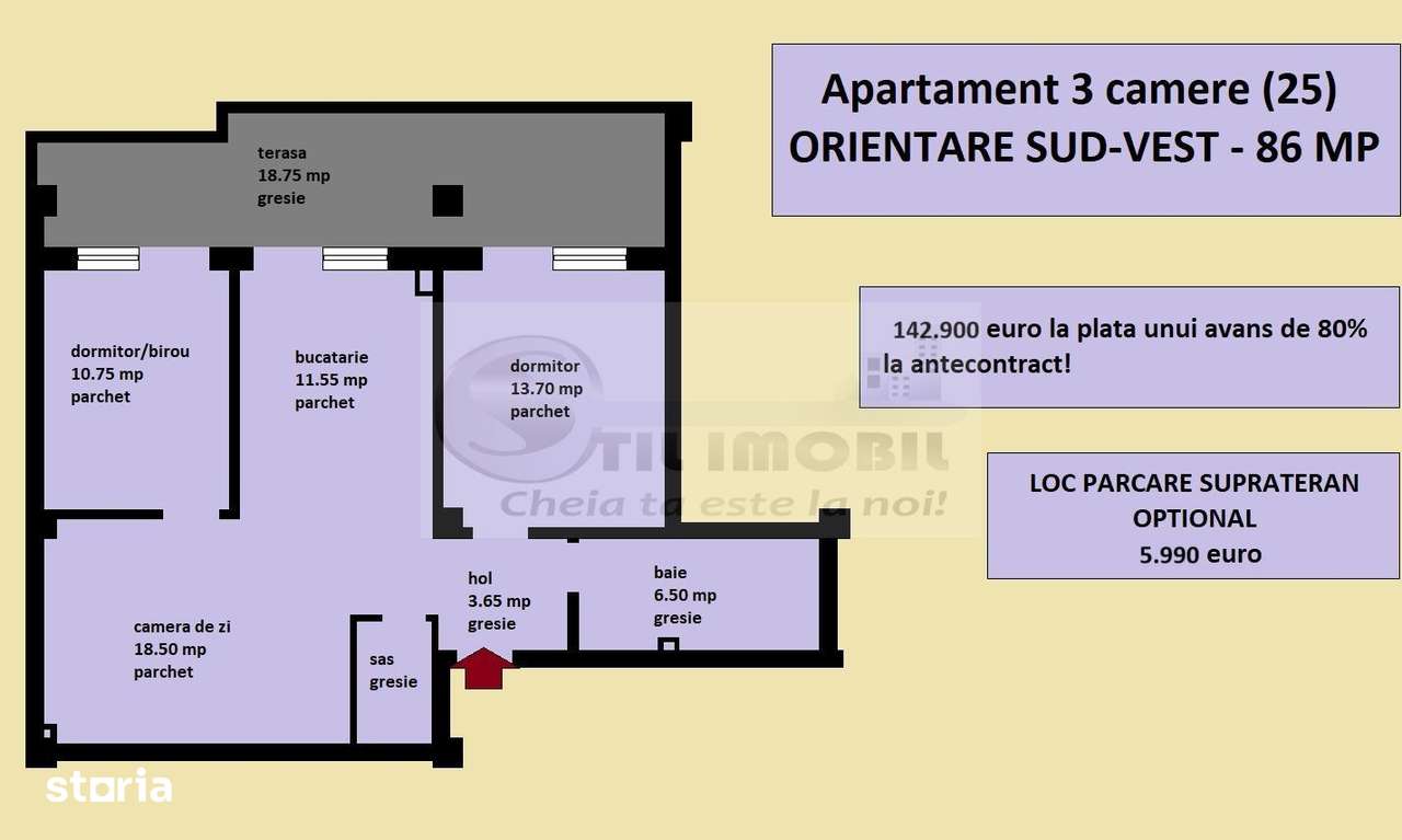 3 cam.decomandat Popas Pacurari-Soleia,et.1/4,78mp,parcareCod:161084