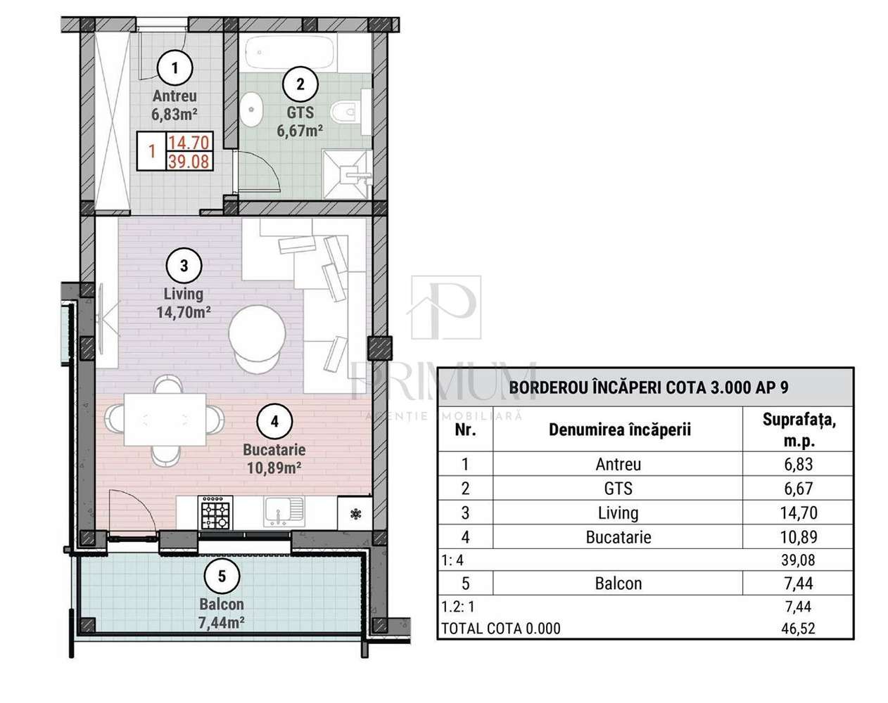 Apartament cu 1 camere 39 mp utili
