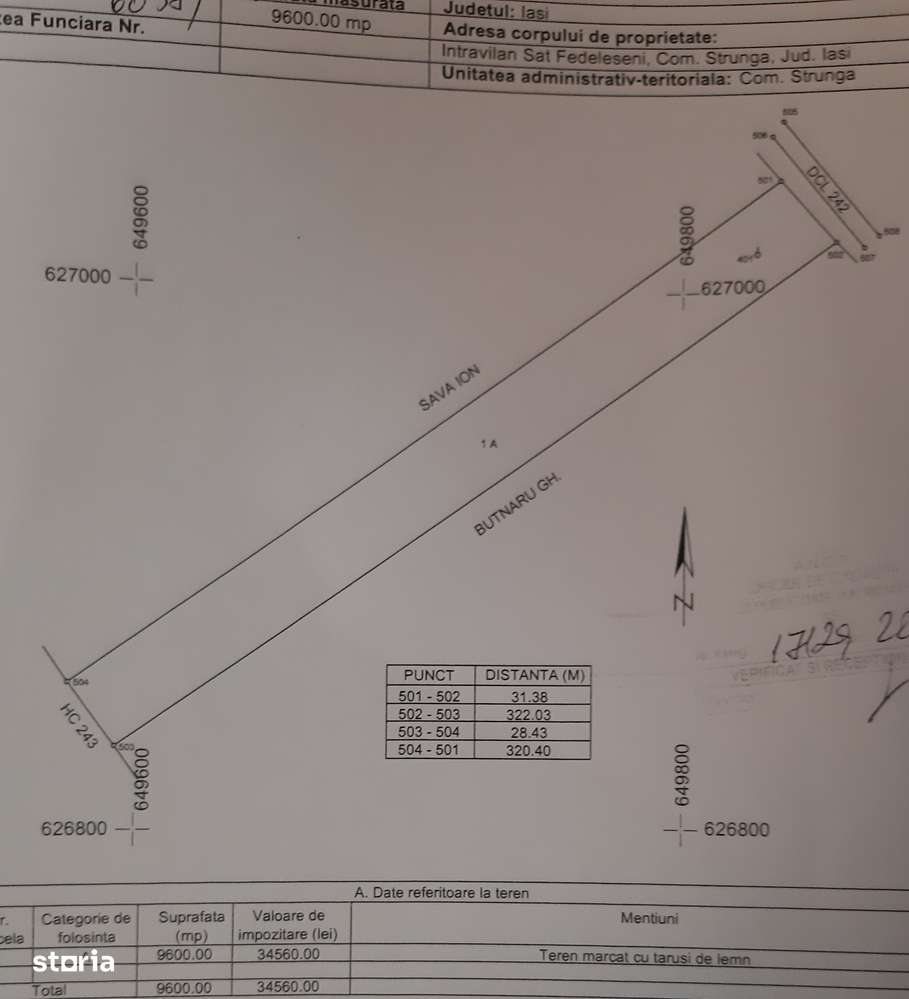 Vind teren intravilan, suprafata 9600 m2, in sat Ferdeleseni, com. Strunga, jud. Iasi. Acces la drum asfaltat,apa, energie electrica. Pe teren este o livada de cca 5000 m2