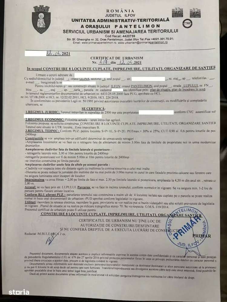 Proprietar I Teren Pantelimon Rascoalei 1562 mp 4km Metrou I COM 0%